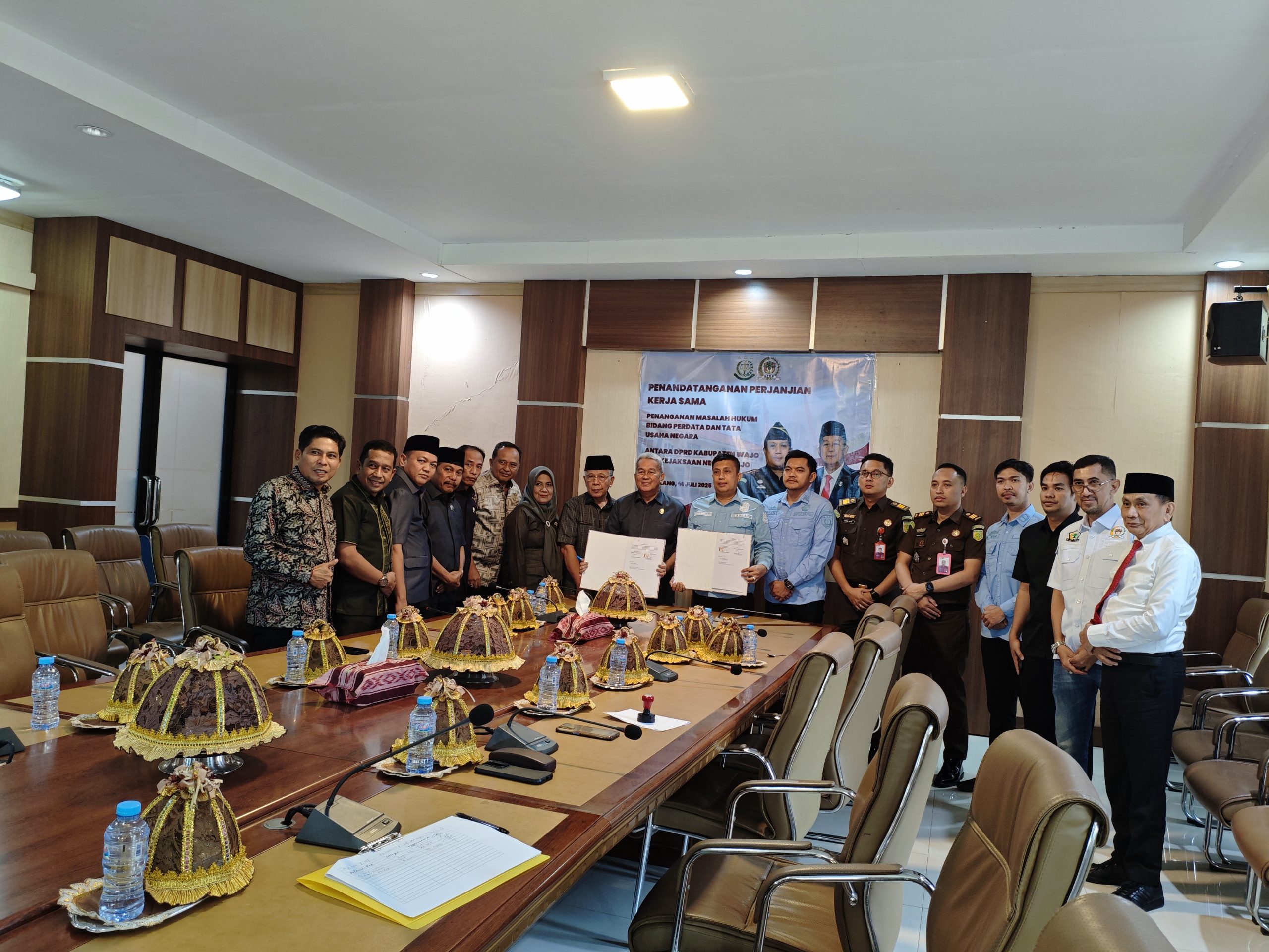 WAJO — Dewan Perwakilan Rakyat Daerah (DPRD) Kabupaten Wajo menandatangani perjanjian kerja sama dengan Kejaksaan Negeri Wajo terkait penanganan masalah hukum di bidang perdata dan tata usaha negara (TUN), Selasa, 1 Juli 2025. Penandatanganan nota kesepahaman (MoU) yang berlangsung di ruang pimpinan DPRD tersebut menjadi langkah konkret memperkuat sinergi antarlembaga demi tata kelola pemerintahan yang profesional, bersih, dan akuntabel.
